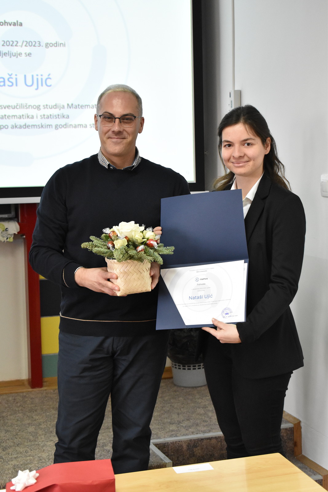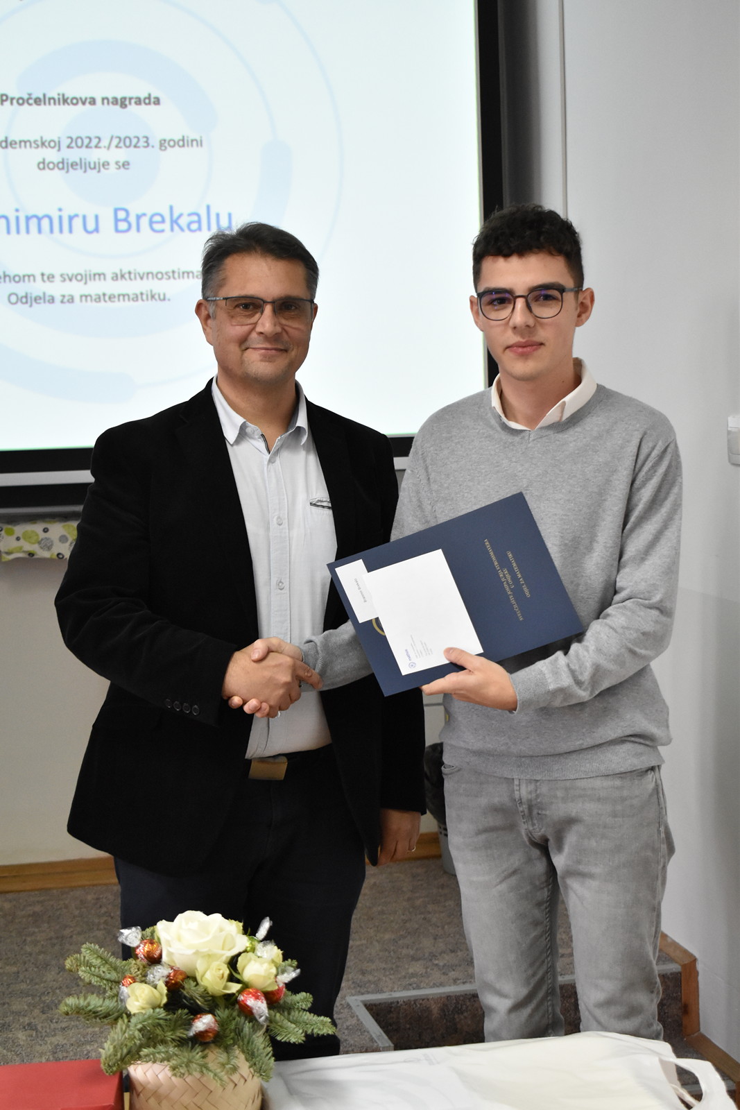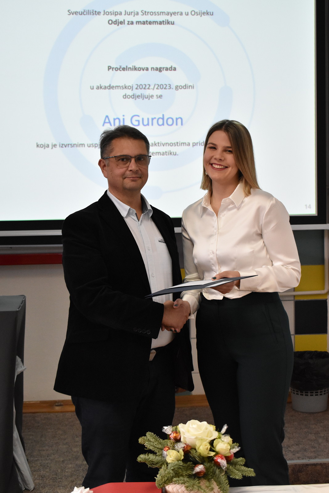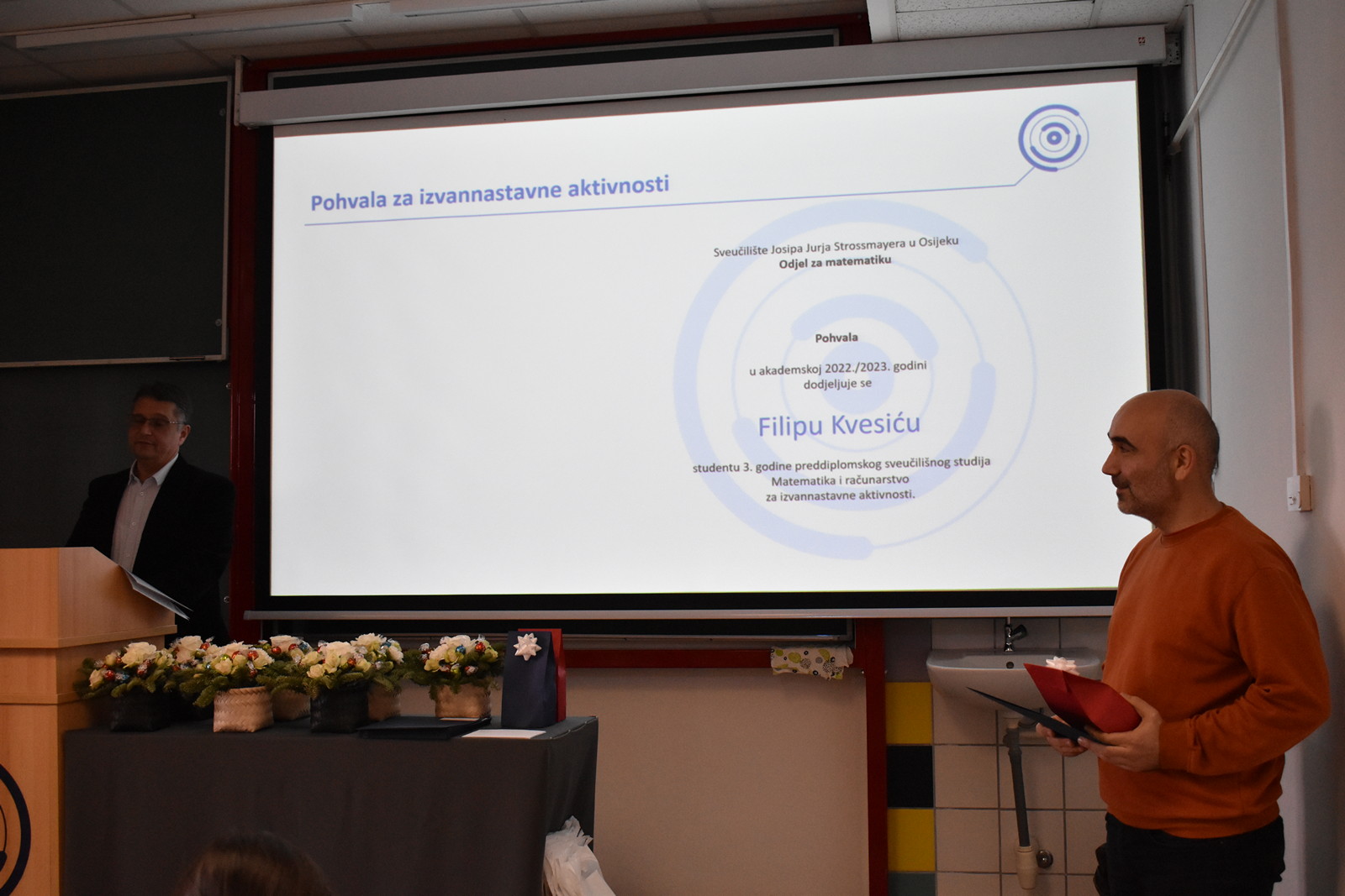 19/12/2022 Izvrsnost prije svega: dodjela pohvala i nagrada studentima Odjela za matematiku Tradicionalno, u okviru posljednje sjednice Vijeća Odjela u kalendarskoj godini na Odjelu za matematiku, u ponedjeljak 19. prosinca 2022. u 12:00 u Dvorani 1, dodijeljene su pohvale i nagrade najuspješnijim studentima matematike, matematike i računarstva te matematike i informatike u tri kategorije: Pohvala za izvannastavne aktivnosti, Pohvala za uspješnost u studiranju po godinama studija te Pročelnikova nagrada. Ove godine Pohvala za izvannastavne aktivnosti dodijeljena je Filipu Kvesiću, studentu 3. godine preddiplomskog sveučilišnog studija Matematika i računarstvo te Nataši Ujić i Tihani Vuković, studenticama 2. godine diplomskog sveučilišnog studija Matematika, smjer Financijska matematika i statistika. Ova se pohvala dodjeljuje za sudjelovanje u izvannastavnim aktivnostima koje doprinose ugledu Odjela za matematiku. Pohvala za uspješnost u studiranju po godinama studija dodjeljuju se studentima po godinama studija za najviši prosjek ocjena u prethodnoj akademskoj godini. Ove godine dobitnici pohvala su: Ema Benko – prosjek ocjena: 4.276 (preddiplomski sveučilišni studij Matematika), Lorena Lončarević – prosjek ocjena: 4.949 (preddiplomski sveučilišni studij Matematika), Ivo Sušac – prosjek ocjena 4.948 (preddiplomski sveučilišni studij Matematika i računarstvo), Branimir Brekalo – prosjek ocjena 4.504 (preddiplomski sveučilišni studij Matematika i računarstvo), Nataša Ujić – prosjek ocjena: 4.383 (diplomski sveučilišni studij Matematika, smjer: Financijska matematika i statistika), Josipa Sabljo – prosjek ocjena: 4.377 (diplomski sveučilišni studij Matematika, smjer: Matematika i računarstvo) te Ana Gurdon – prosjek ocjena: 5.000 (diplomski sveučilišni studij Matematika i informatika, smjer: nastavnički). Pročelnikova nagrada dodjeljuje se jednom studentu završne godine svakog preddiplomskog i diplomskog studija ako ima ukupnu ocjenu uspjeha na studiju najmanje 4.500. Nagrada se dodjeljuje studentima koji su svojim aktivnostima pridonijeli ugledu Odjela za matematiku. Ova se nagrada sastoji od pisane plakete i novčane nagrade u iznosu od 1.000 kuna. Ovogodišnji dobitnici su: Lorena Lončarević na preddiplomskom sveučilišnom studiju Matematika (ukupni prosjek ocjena 4,949), Branimir Brekalo na preddiplomskom sveučilišnom studiju Matematika i računarstvo (ukupni prosjek ocjena 4,504), te Ana Gurdon na diplomskom sveučilišnom studiju Matematika i informatika, smjer: nastavnički (ukupni prosjek ocjena 5,000).