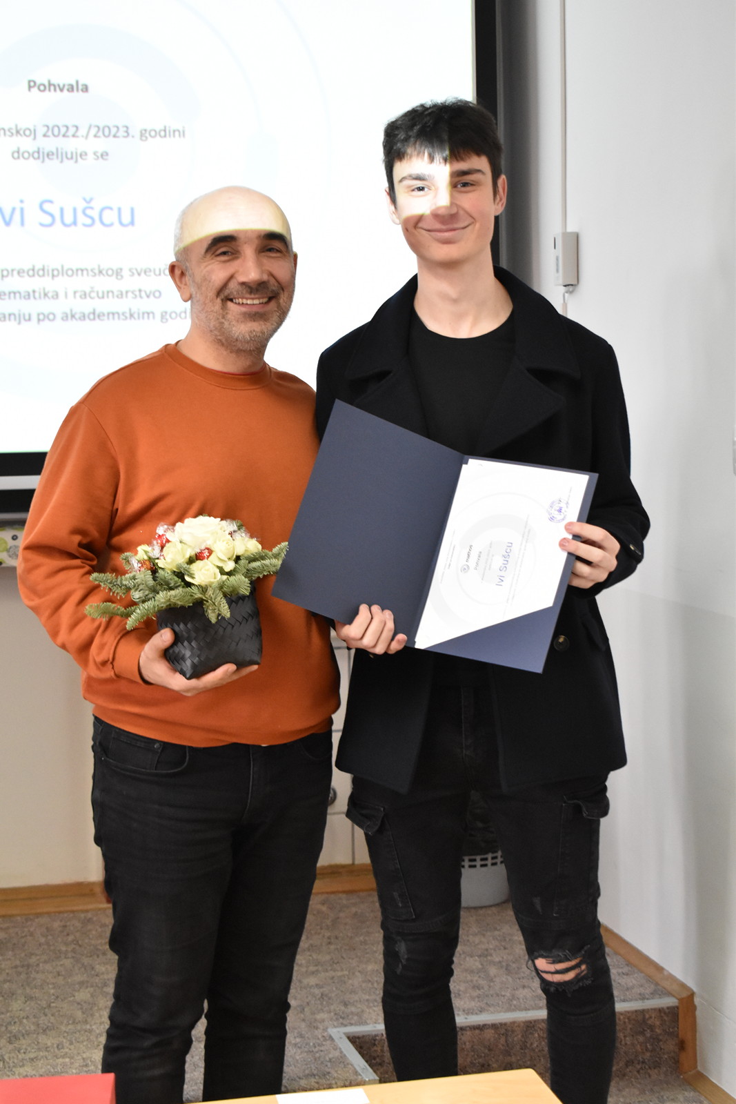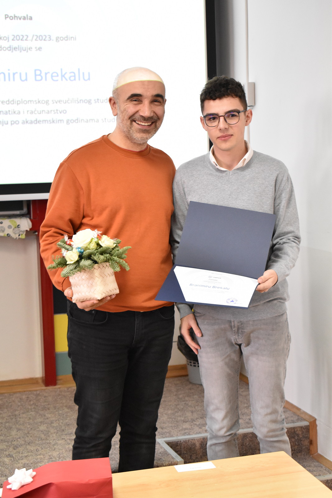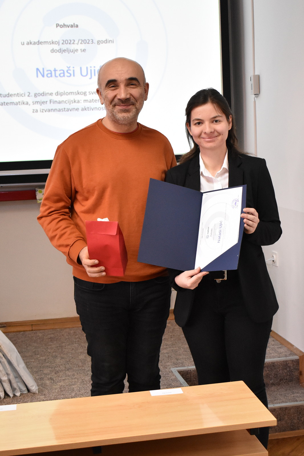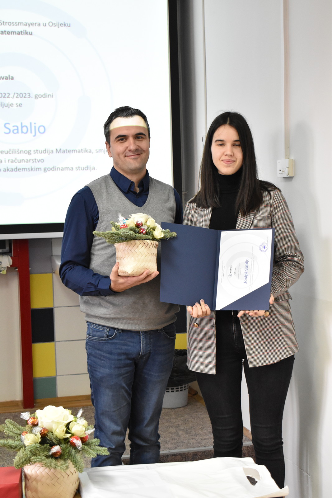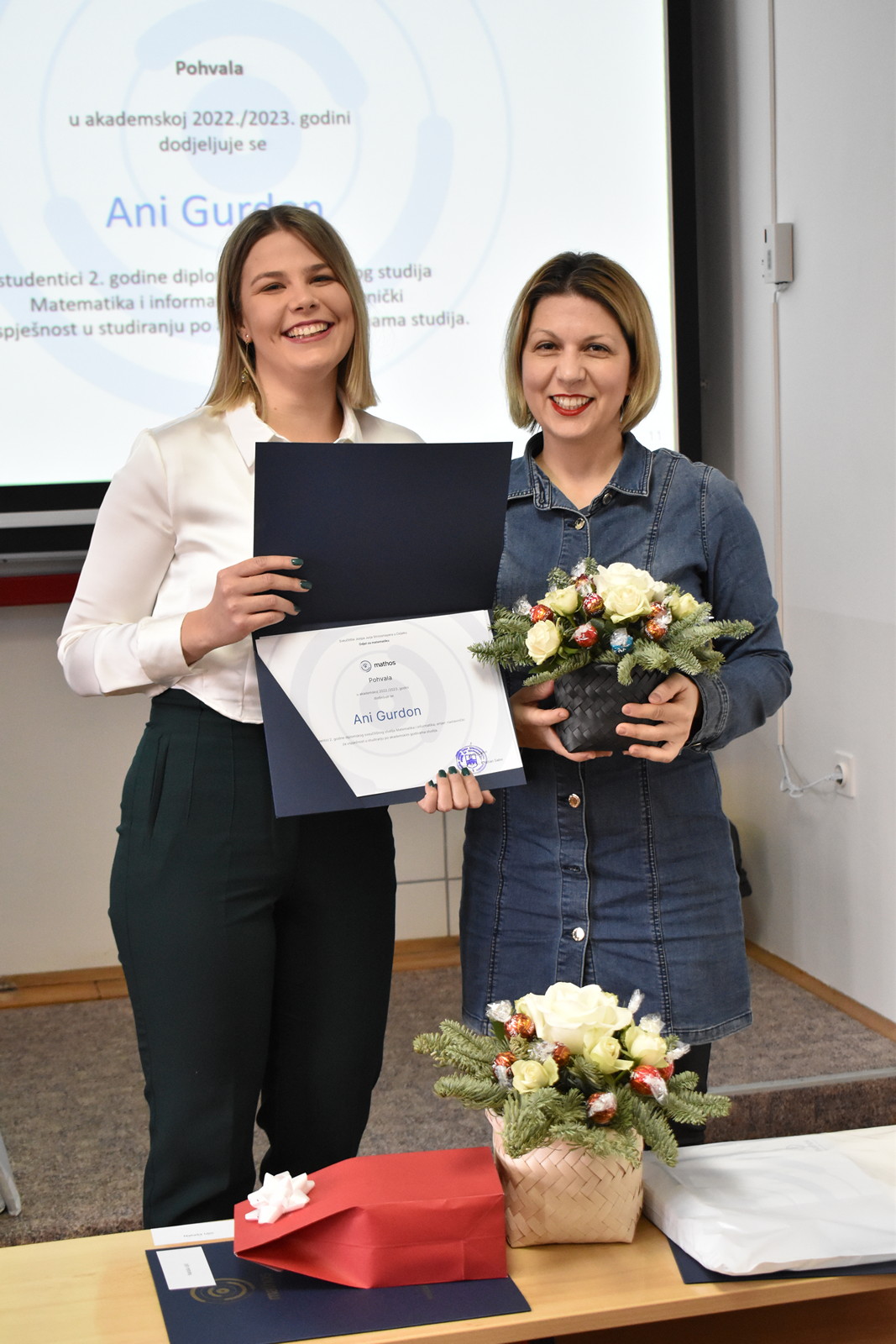 19/12/2022 Izvrsnost prije svega: dodjela pohvala i nagrada studentima Odjela za matematiku Tradicionalno, u okviru posljednje sjednice Vijeća Odjela u kalendarskoj godini na Odjelu za matematiku, u ponedjeljak 19. prosinca 2022. u 12:00 u Dvorani 1, dodijeljene su pohvale i nagrade najuspješnijim studentima matematike, matematike i računarstva te matematike i informatike u tri kategorije: Pohvala za izvannastavne aktivnosti, Pohvala za uspješnost u studiranju po godinama studija te Pročelnikova nagrada. Ove godine Pohvala za izvannastavne aktivnosti dodijeljena je Filipu Kvesiću, studentu 3. godine preddiplomskog sveučilišnog studija Matematika i računarstvo te Nataši Ujić i Tihani Vuković, studenticama 2. godine diplomskog sveučilišnog studija Matematika, smjer Financijska matematika i statistika. Ova se pohvala dodjeljuje za sudjelovanje u izvannastavnim aktivnostima koje doprinose ugledu Odjela za matematiku. Pohvala za uspješnost u studiranju po godinama studija dodjeljuju se studentima po godinama studija za najviši prosjek ocjena u prethodnoj akademskoj godini. Ove godine dobitnici pohvala su: Ema Benko – prosjek ocjena: 4.276 (preddiplomski sveučilišni studij Matematika), Lorena Lončarević – prosjek ocjena: 4.949 (preddiplomski sveučilišni studij Matematika), Ivo Sušac – prosjek ocjena 4.948 (preddiplomski sveučilišni studij Matematika i računarstvo), Branimir Brekalo – prosjek ocjena 4.504 (preddiplomski sveučilišni studij Matematika i računarstvo), Nataša Ujić – prosjek ocjena: 4.383 (diplomski sveučilišni studij Matematika, smjer: Financijska matematika i statistika), Josipa Sabljo – prosjek ocjena: 4.377 (diplomski sveučilišni studij Matematika, smjer: Matematika i računarstvo) te Ana Gurdon – prosjek ocjena: 5.000 (diplomski sveučilišni studij Matematika i informatika, smjer: nastavnički). Pročelnikova nagrada dodjeljuje se jednom studentu završne godine svakog preddiplomskog i diplomskog studija ako ima ukupnu ocjenu uspjeha na studiju najmanje 4.500. Nagrada se dodjeljuje studentima koji su svojim aktivnostima pridonijeli ugledu Odjela za matematiku. Ova se nagrada sastoji od pisane plakete i novčane nagrade u iznosu od 1.000 kuna. Ovogodišnji dobitnici su: Lorena Lončarević na preddiplomskom sveučilišnom studiju Matematika (ukupni prosjek ocjena 4,949), Branimir Brekalo na preddiplomskom sveučilišnom studiju Matematika i računarstvo (ukupni prosjek ocjena 4,504), te Ana Gurdon na diplomskom sveučilišnom studiju Matematika i informatika, smjer: nastavnički (ukupni prosjek ocjena 5,000).