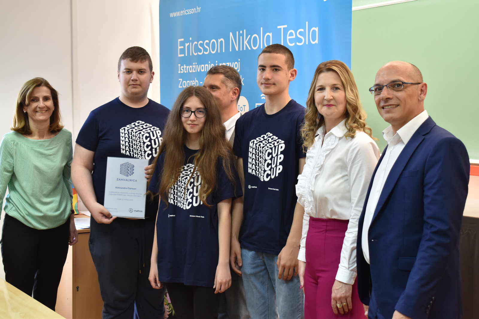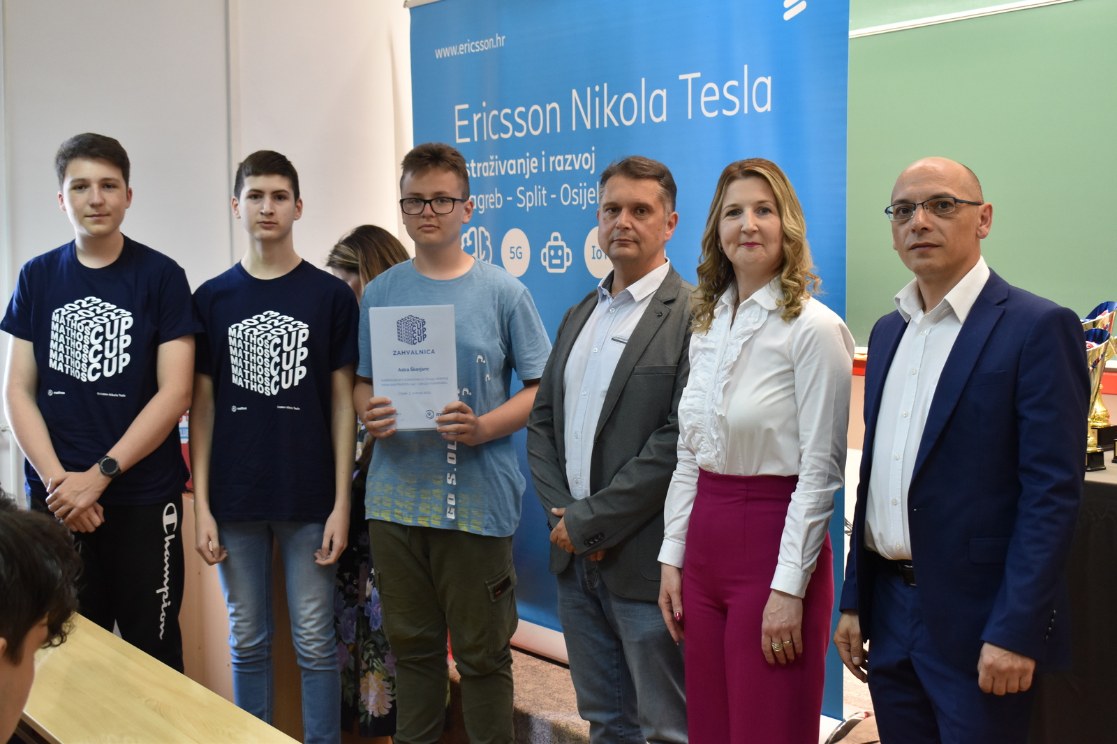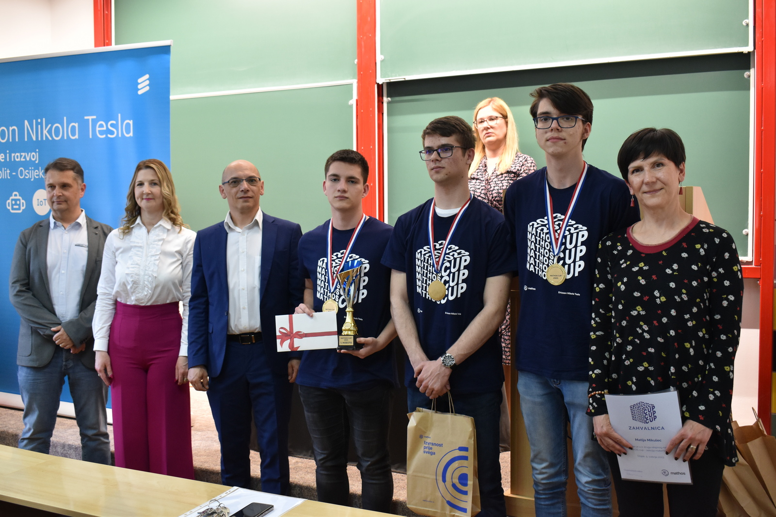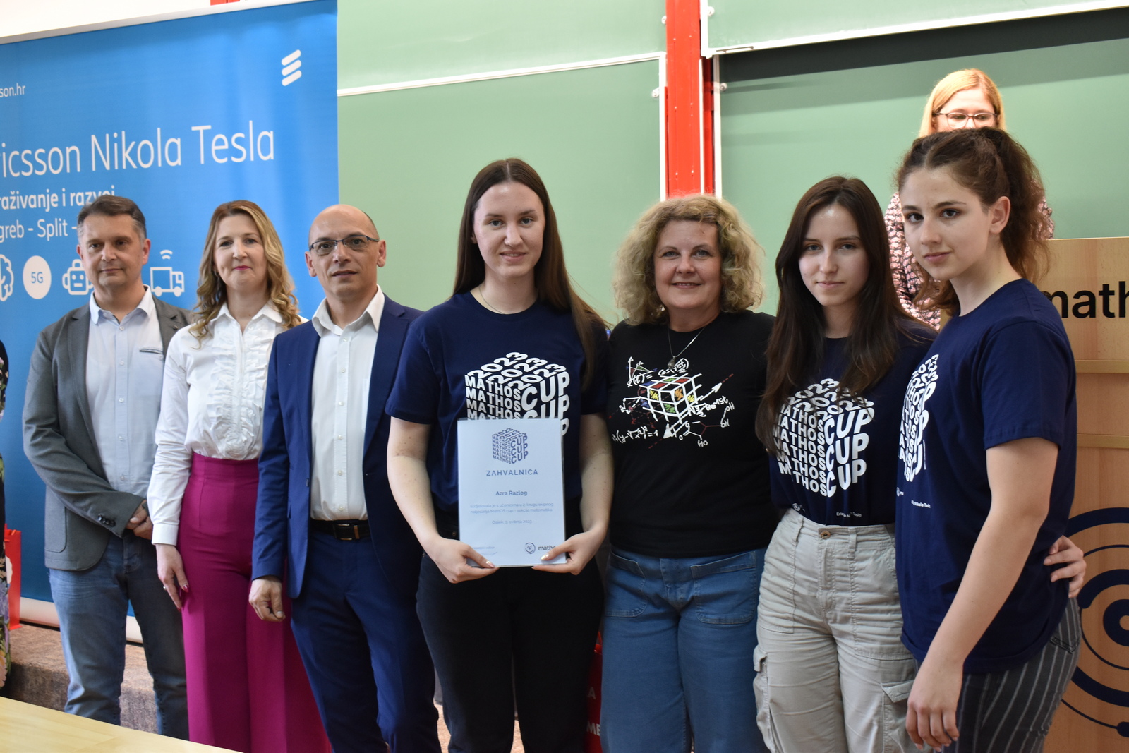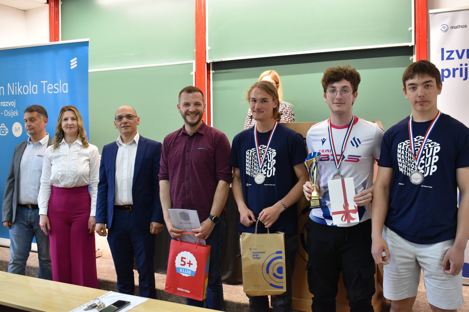 07/05/2023 MathOS cup 2023 U petak 5. svibnja 2023. održan je finalni krug timskog natjecanja MathOS Cup – sekcija matematika. Od 675 učenika iz 33 škole iz cijele Hrvatske koji su sudjelovali u 1. krugu natjecanja, u finalni krug pozvano je po 7 najboljih timova iz svakog razreda. U 1. razredu pobjedu je odnio tim „ez“ iz III. gimnazije Osijek, drugo mjesto pripalo je timu „Ked“ iz Gimnazije Sesvete dok je treće mjesto zauzeo tim „GIMNACK1F“ iz Gimnazije Josipa Slavenskog Čakovec. U ovoj kategoriji sudjelovali su još i timovi „Prazan skup“ i „Dva i po“ iz III. gimnazije Osijek, „BOM“ iz X. gimnazije Ivan Supek Zagreb te „Vito^2“ iz Gimnazije Pula. U 2. razredu zlatni tim je „Dingači“ iz Prve gimnazije Varaždin, srebro su osvojili „GORMITI“ iz Gimnazije Petra Preradovića Virovitica, dok su brončani „BETE“ iz Tehničke škole Karlovac. U ovoj kategoriji sudjelovali su još i timovi „pola od nule“ iz Srednje škole Zlatar, „VRHOVNI G“ iz Gimnazije Matije Antuna Reljkovića Vinkovci te „Hexagoni“ iz X. gimnazije Ivan Supek Zagreb. Pobjednički tim u 3. razredu je „3M“ iz Srednje škole Zlatar, drugo mjesto pripalo je timu „Studenci“ iz Gimnazije Pula, a na trećem mjestu je tim „Matko“ iz Gimnazije Sesvete. Sudjelovali su i timovi „Gotham“ iz Gimnazije dr. Mate Ujevića u Imotskom, „Doktori“ iz Gimnazije Matije Antuna Reljkovića Vinkovci, „GJS-VLV“ iz Gimnazije Josipa Slavenskog Čakovec te „AlletuN“ iz III. gimnazije Osijek. U 4. razredu zlatni tim je „ZIHOS“ iz III. gimnazije Osijek, srebrni su „Tafroamerikanci“ iz Gimnazije Pula, a brončani „Snjeguljice“ iz Srednje škola Zlatar. Sudjelovali su i timovi „Kolege“ iz X. gimnazije Ivan Supek, „IT Klub Božo Lagan“ iz XIII. Gimnazije Zagreb, „TROUGAO“ iz Gimnazije Josipa Slavenskog Čakovec te „SMEŠ“ iz Gimnazije Petra Preradovića Virovitica. Zahvaljujemo se ovogodišnjem sponzoru MathOS Cup-a Ericsson Nikola Tesla te čestitamo svim sudionicima i mentorima!