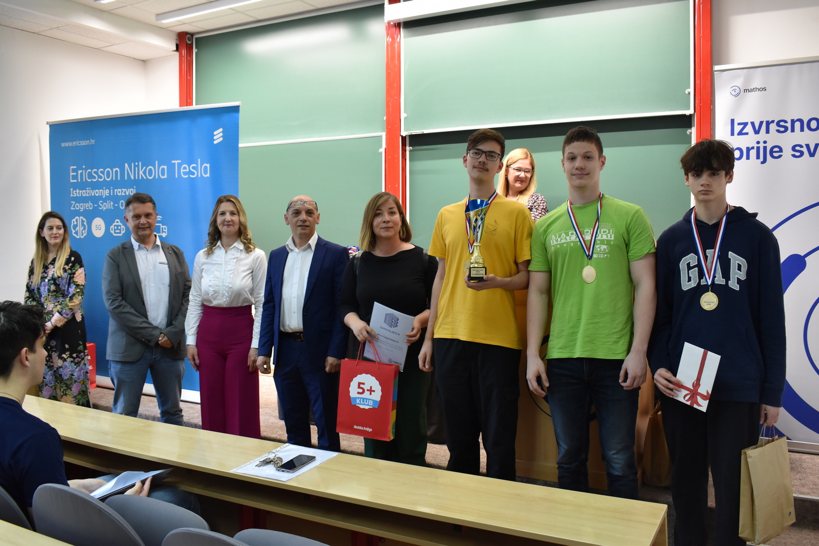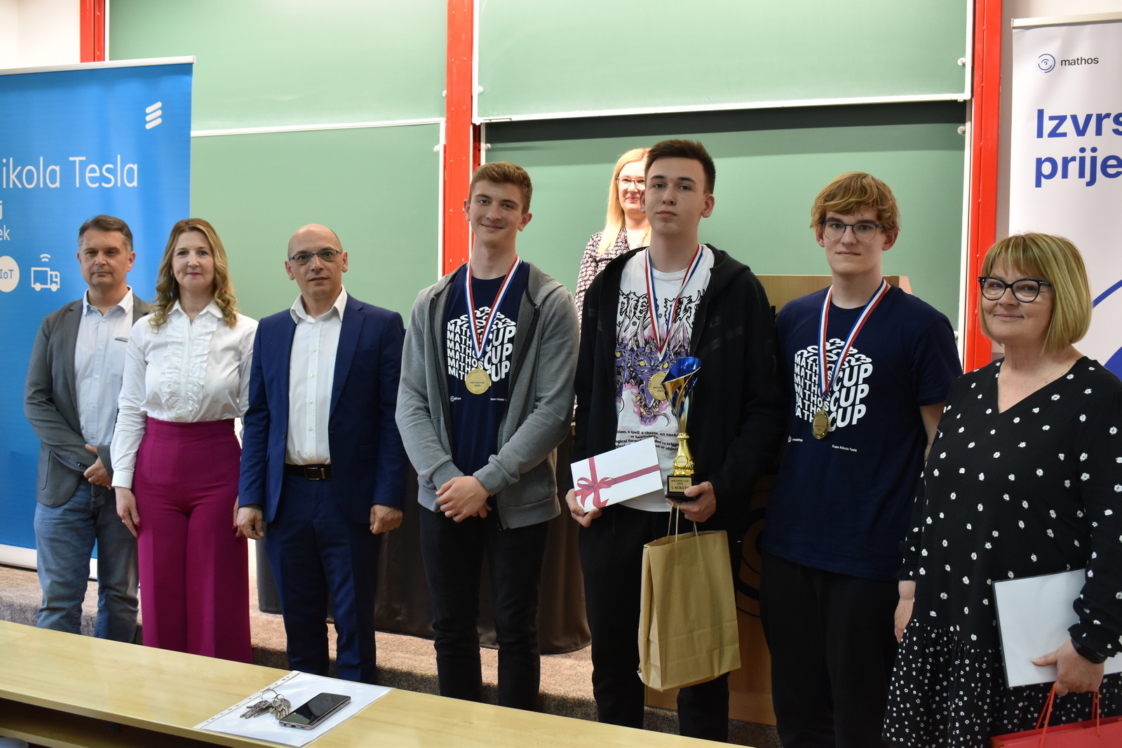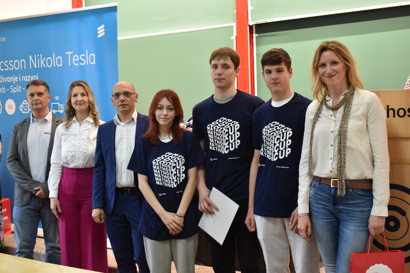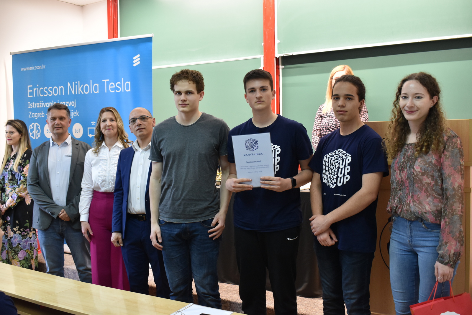 07/05/2023 MathOS cup 2023 U petak 5. svibnja 2023. održan je finalni krug timskog natjecanja MathOS Cup – sekcija matematika. Od 675 učenika iz 33 škole iz cijele Hrvatske koji su sudjelovali u 1. krugu natjecanja, u finalni krug pozvano je po 7 najboljih timova iz svakog razreda. U 1. razredu pobjedu je odnio tim „ez“ iz III. gimnazije Osijek, drugo mjesto pripalo je timu „Ked“ iz Gimnazije Sesvete dok je treće mjesto zauzeo tim „GIMNACK1F“ iz Gimnazije Josipa Slavenskog Čakovec. U ovoj kategoriji sudjelovali su još i timovi „Prazan skup“ i „Dva i po“ iz III. gimnazije Osijek, „BOM“ iz X. gimnazije Ivan Supek Zagreb te „Vito^2“ iz Gimnazije Pula. U 2. razredu zlatni tim je „Dingači“ iz Prve gimnazije Varaždin, srebro su osvojili „GORMITI“ iz Gimnazije Petra Preradovića Virovitica, dok su brončani „BETE“ iz Tehničke škole Karlovac. U ovoj kategoriji sudjelovali su još i timovi „pola od nule“ iz Srednje škole Zlatar, „VRHOVNI G“ iz Gimnazije Matije Antuna Reljkovića Vinkovci te „Hexagoni“ iz X. gimnazije Ivan Supek Zagreb. Pobjednički tim u 3. razredu je „3M“ iz Srednje škole Zlatar, drugo mjesto pripalo je timu „Studenci“ iz Gimnazije Pula, a na trećem mjestu je tim „Matko“ iz Gimnazije Sesvete. Sudjelovali su i timovi „Gotham“ iz Gimnazije dr. Mate Ujevića u Imotskom, „Doktori“ iz Gimnazije Matije Antuna Reljkovića Vinkovci, „GJS-VLV“ iz Gimnazije Josipa Slavenskog Čakovec te „AlletuN“ iz III. gimnazije Osijek. U 4. razredu zlatni tim je „ZIHOS“ iz III. gimnazije Osijek, srebrni su „Tafroamerikanci“ iz Gimnazije Pula, a brončani „Snjeguljice“ iz Srednje škola Zlatar. Sudjelovali su i timovi „Kolege“ iz X. gimnazije Ivan Supek, „IT Klub Božo Lagan“ iz XIII. Gimnazije Zagreb, „TROUGAO“ iz Gimnazije Josipa Slavenskog Čakovec te „SMEŠ“ iz Gimnazije Petra Preradovića Virovitica. Zahvaljujemo se ovogodišnjem sponzoru MathOS Cup-a Ericsson Nikola Tesla te čestitamo svim sudionicima i mentorima!
